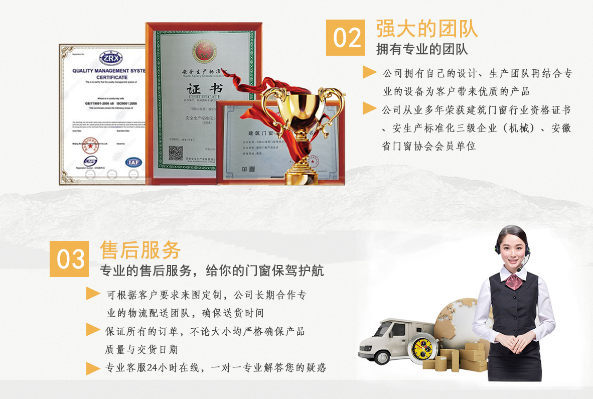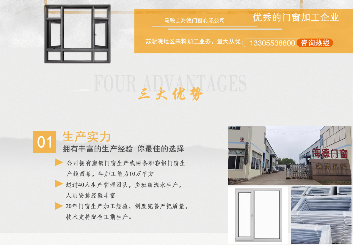 關(guān)于我們馬鞍山海德門窗有限公司是一家主營(yíng)門窗加工的公司,公司主要從事塑鋼門窗、彩鋁門窗、鋁合金陽(yáng)臺(tái)欄桿、鋁合金百葉窗的生產(chǎn)加工。擁有一批熟練的技術(shù)工人和設(shè)計(jì)人員,有著20多年的門窗加工制造經(jīng)驗(yàn)。現(xiàn)擁有2條塑鋼門窗生產(chǎn)線和2條彩鋁門窗生產(chǎn)線,1年加工門窗十萬(wàn)平方米。公司坐落在馬鞍山國(guó)家經(jīng)濟(jì)技術(shù)開發(fā)區(qū),距離馬鞍山高速公路南出口僅3公里,已多次承接了大型門窗來料加工的業(yè)務(wù),受到客戶的一致好評(píng)。隨著市場(chǎng)的發(fā)展和公司的定位,公司愿大量承接蘇浙皖及周邊地區(qū)的門窗來料加工業(yè)務(wù)。隨時(shí)歡迎各新老客戶的來電咨詢及上門參觀洽談,客戶的滿意是海德門窗進(jìn)步前行的動(dòng)力。